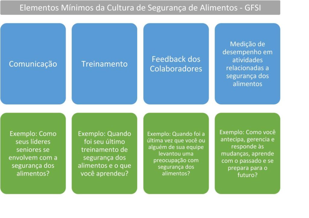 Este documento orientativo fornece também aos auditores qualificados no Esquema FSSC 22000 sobre algumas perguntas sobre cultura de segurança dos alimentos na que podem ser usadas na avaliação da conformidade, garantindo assim a abordagem com base nos elementos mínimos de uma cultura de segurança dos alimentos requeridos pelos GFSI (clique aqui e consulte o documento traduzido), sendo eles: